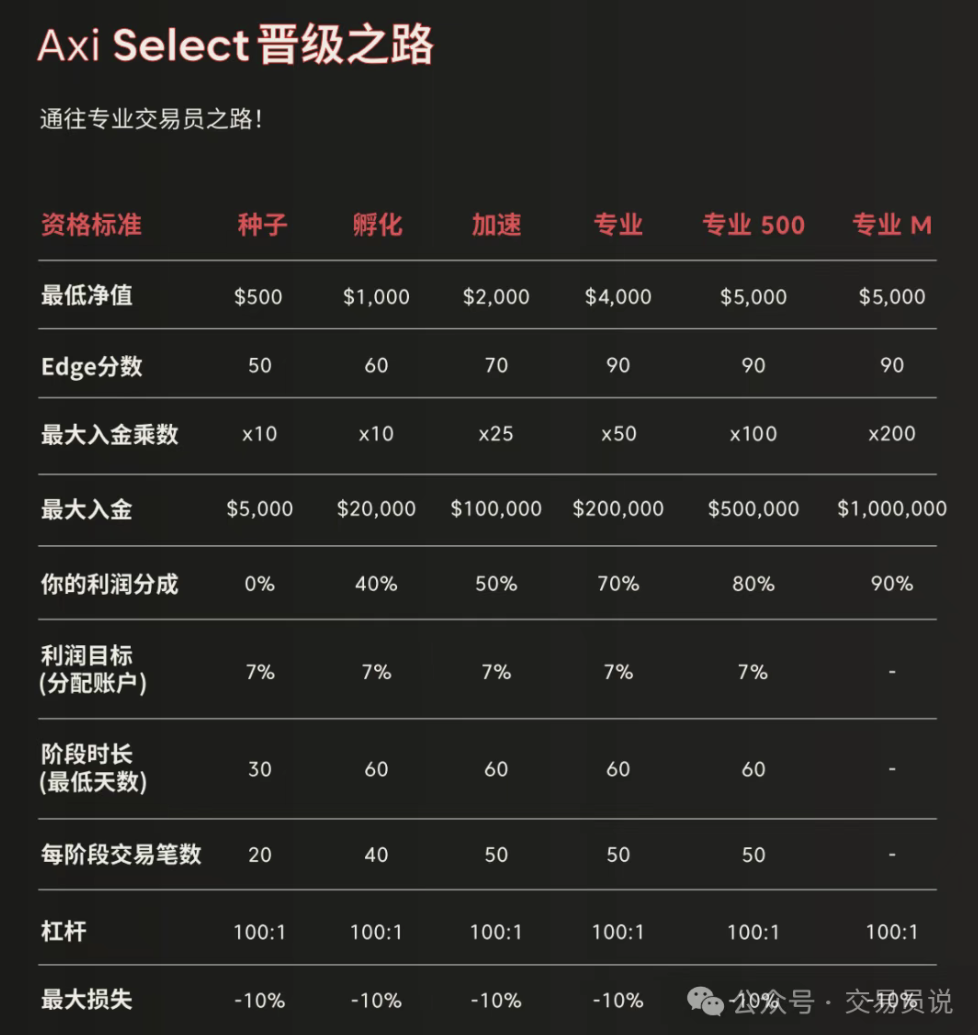 先说真实账户,和模拟账户比,我个人认为最大的优势就是它的阶梯制晋级和退阶,也就是我在前面文章里说的不会“一步归零”。以Axiselect为例,它把操盘手分为6个等级。当我们进入从种子轮进入孵化轮后,就可以享受机构的资金跟单。每晋级一个等级,跟单资金的规模,以及分润比如都会提高。反过来,如果我们中途出现操作失误,退阶时也是逐渐下降,而非直接取消分润资格。